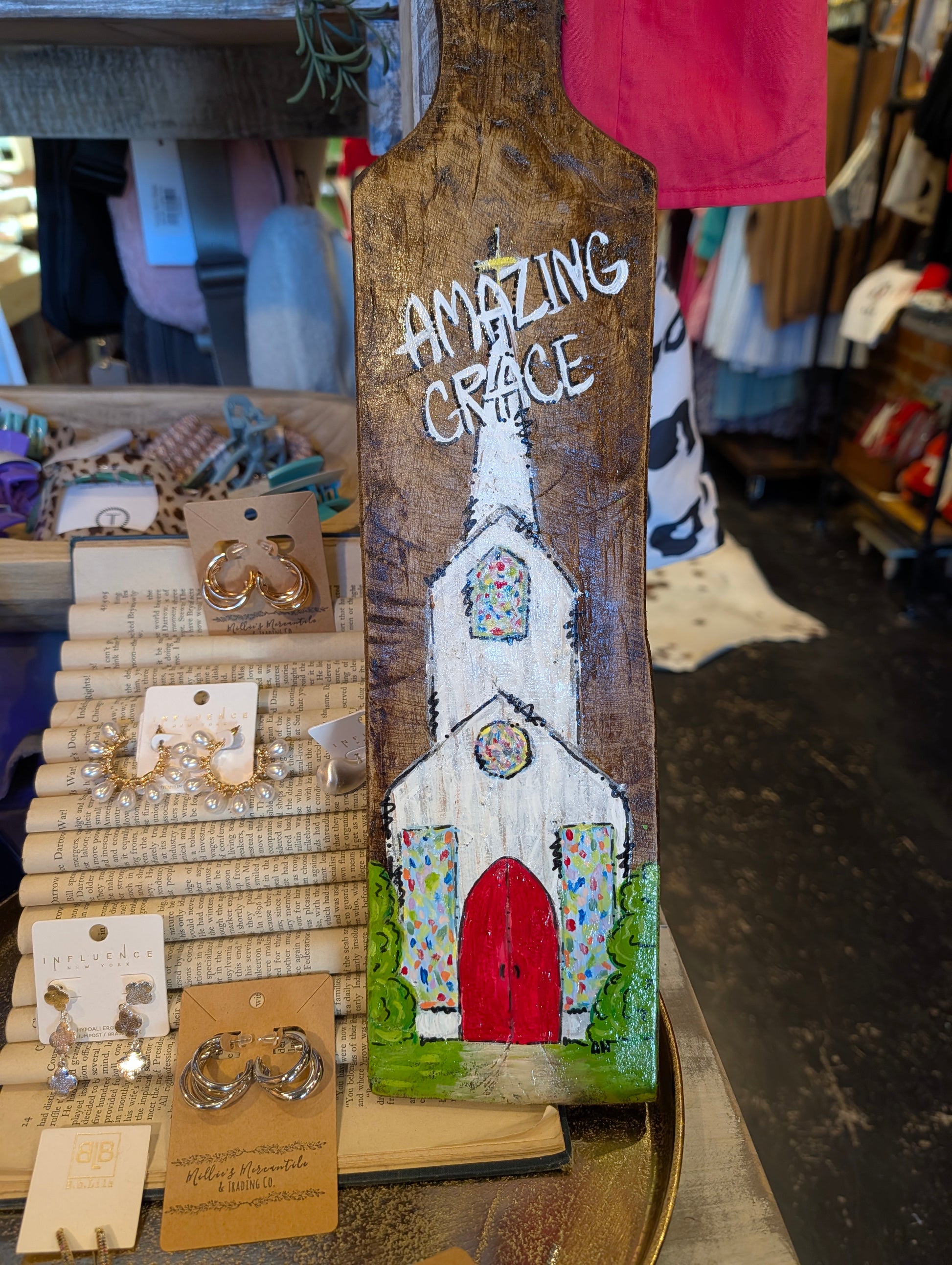 Transform your cheese display with the Amazing Grace Cheeseboard. This hand painted board showcases a charming church with a red door, adding a special touch to any gathering.