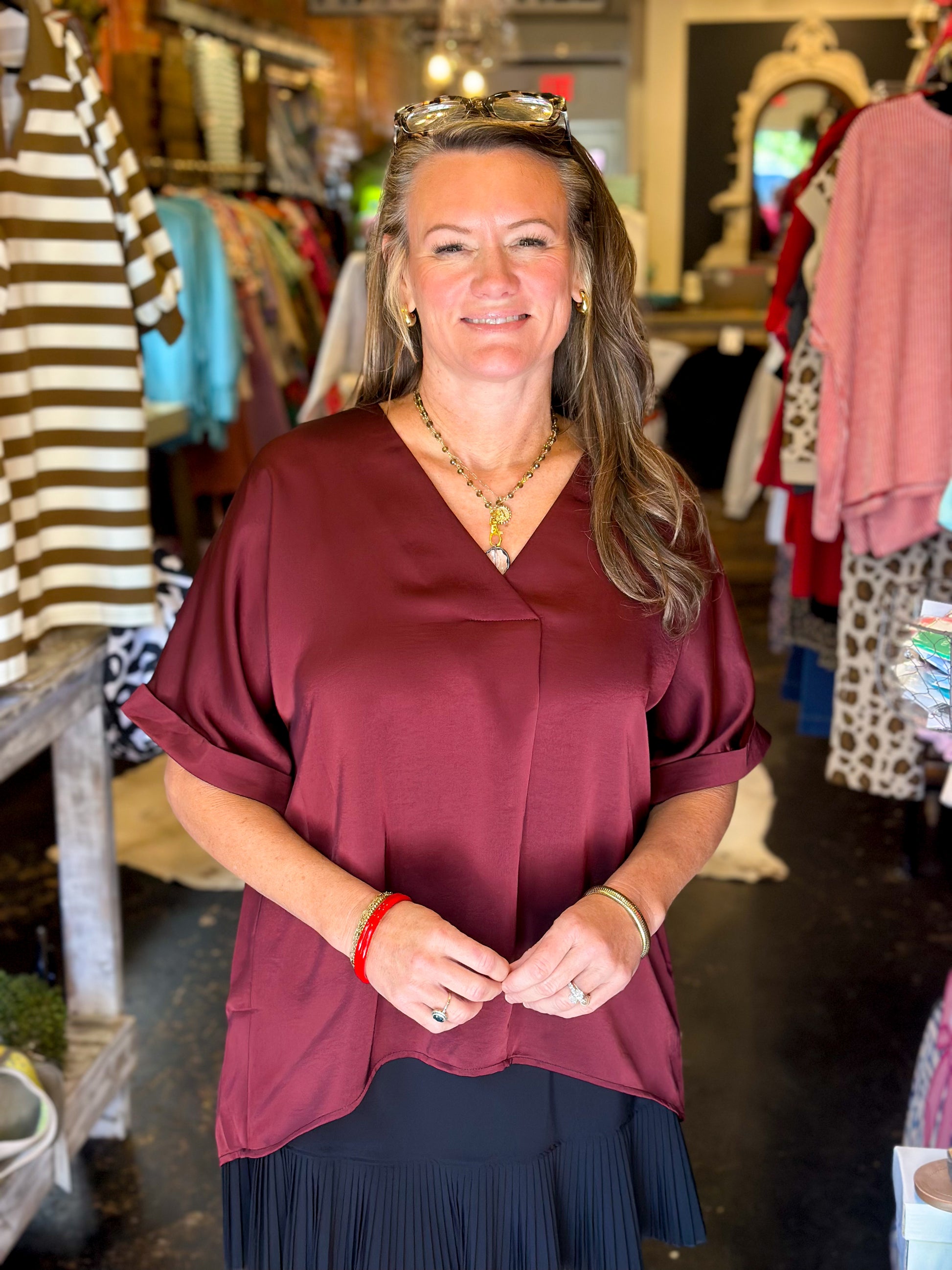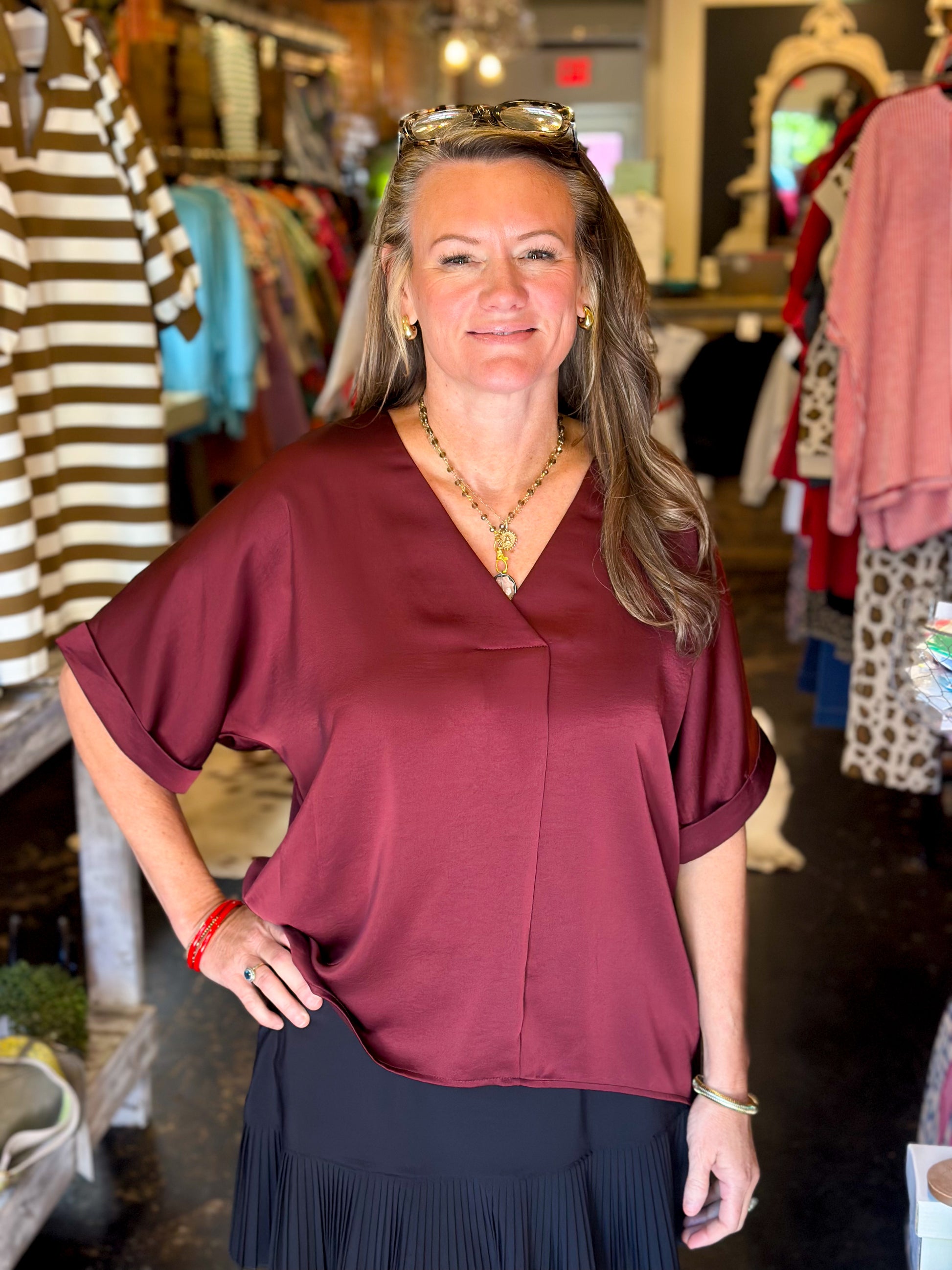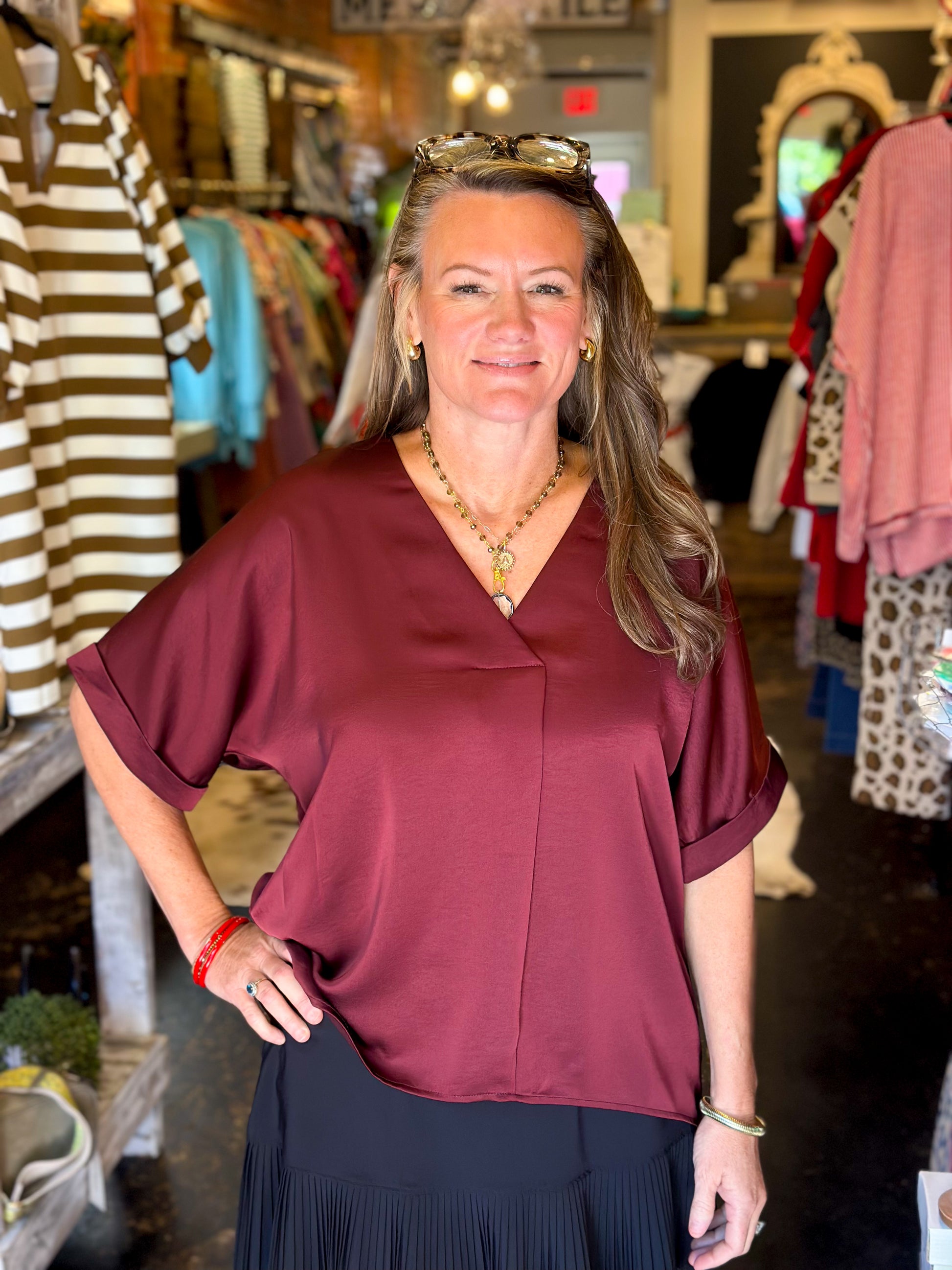 Get ready for the fall season with this stylish Autumn Top! Made with luxurious burgundy satin material, it's perfect for any occasion. Dress it up or down for a versatile and trendy look.