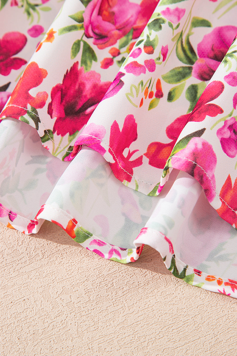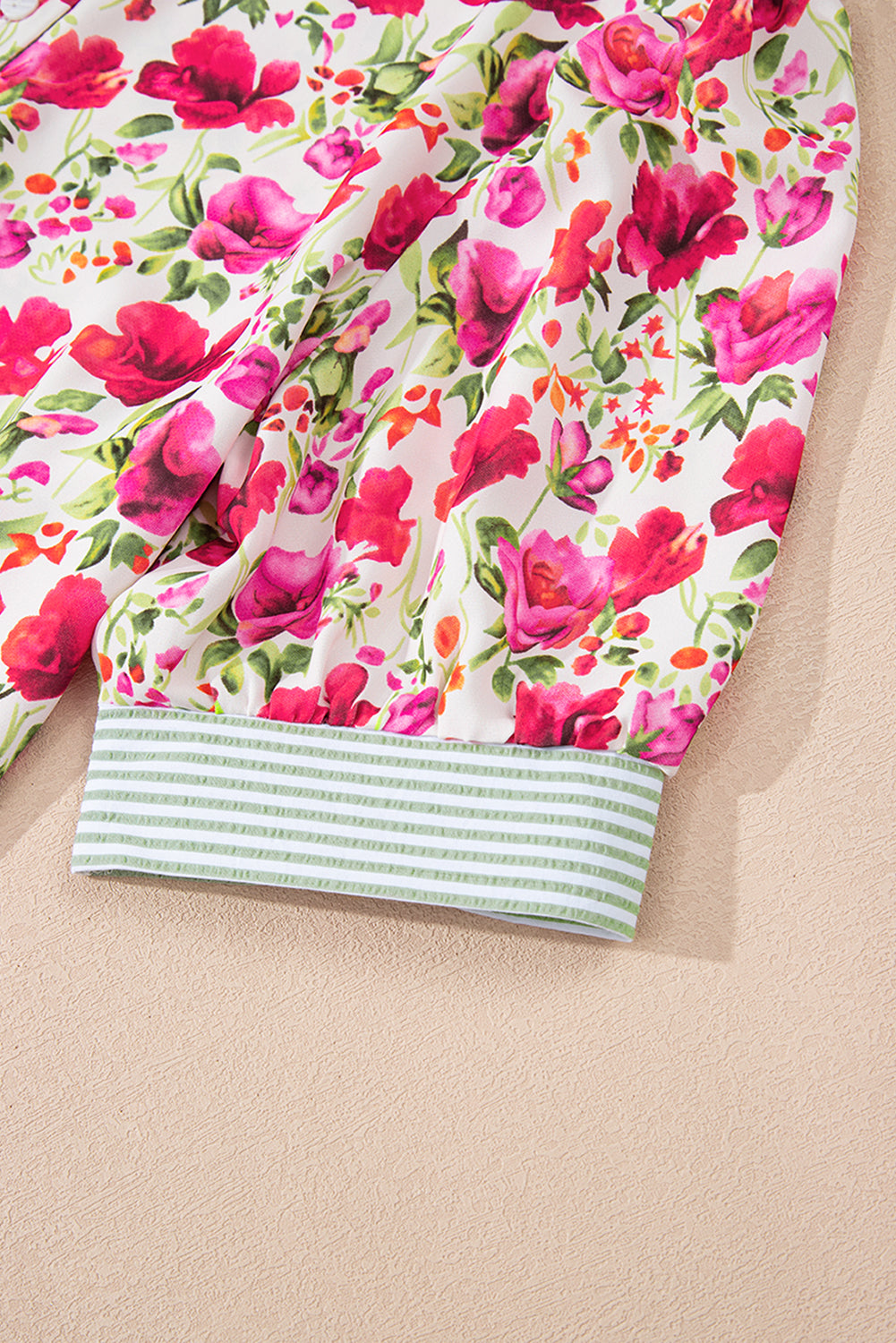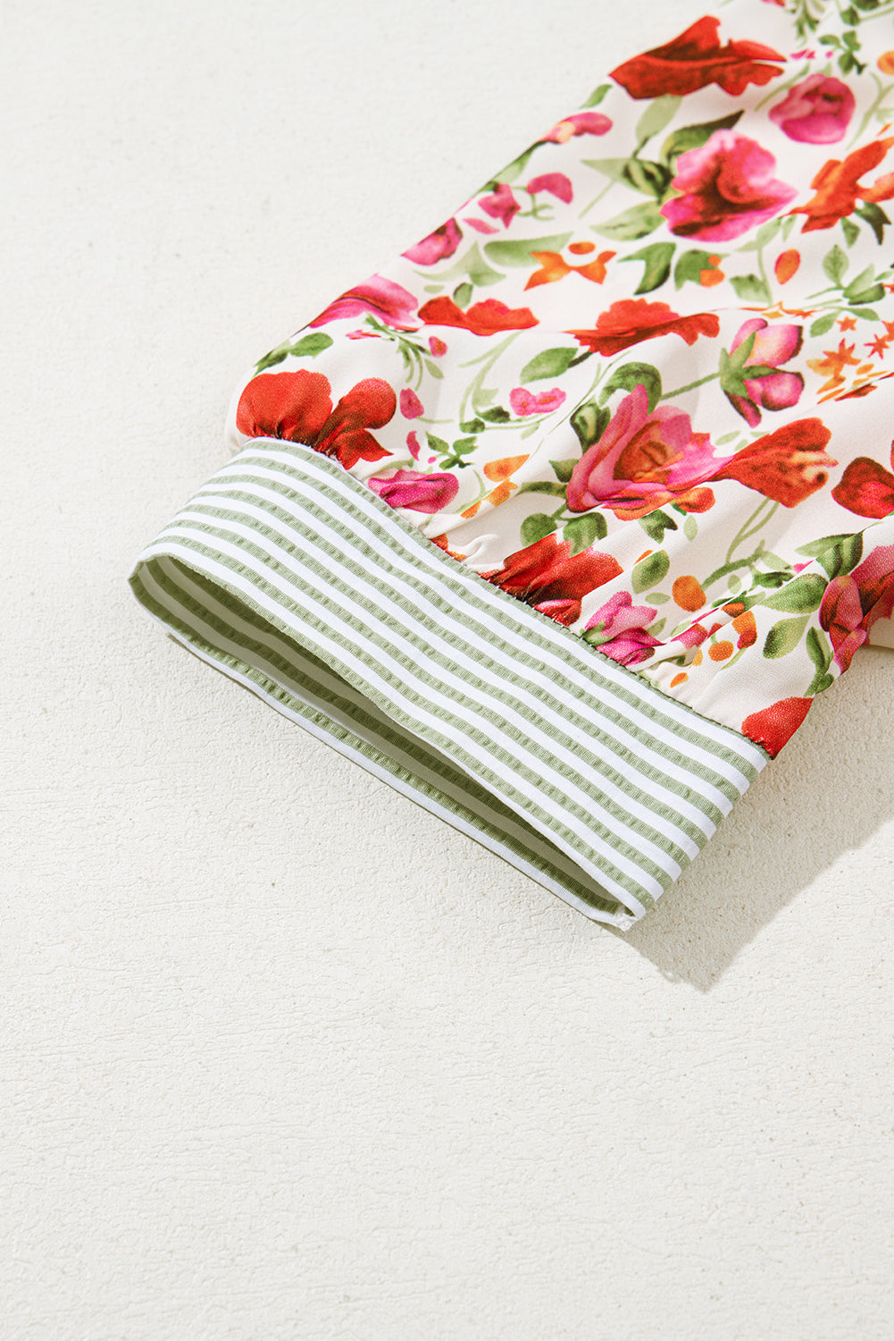 Red Floral Print Striped Patchwork Collared Short Sleeve Blouse
