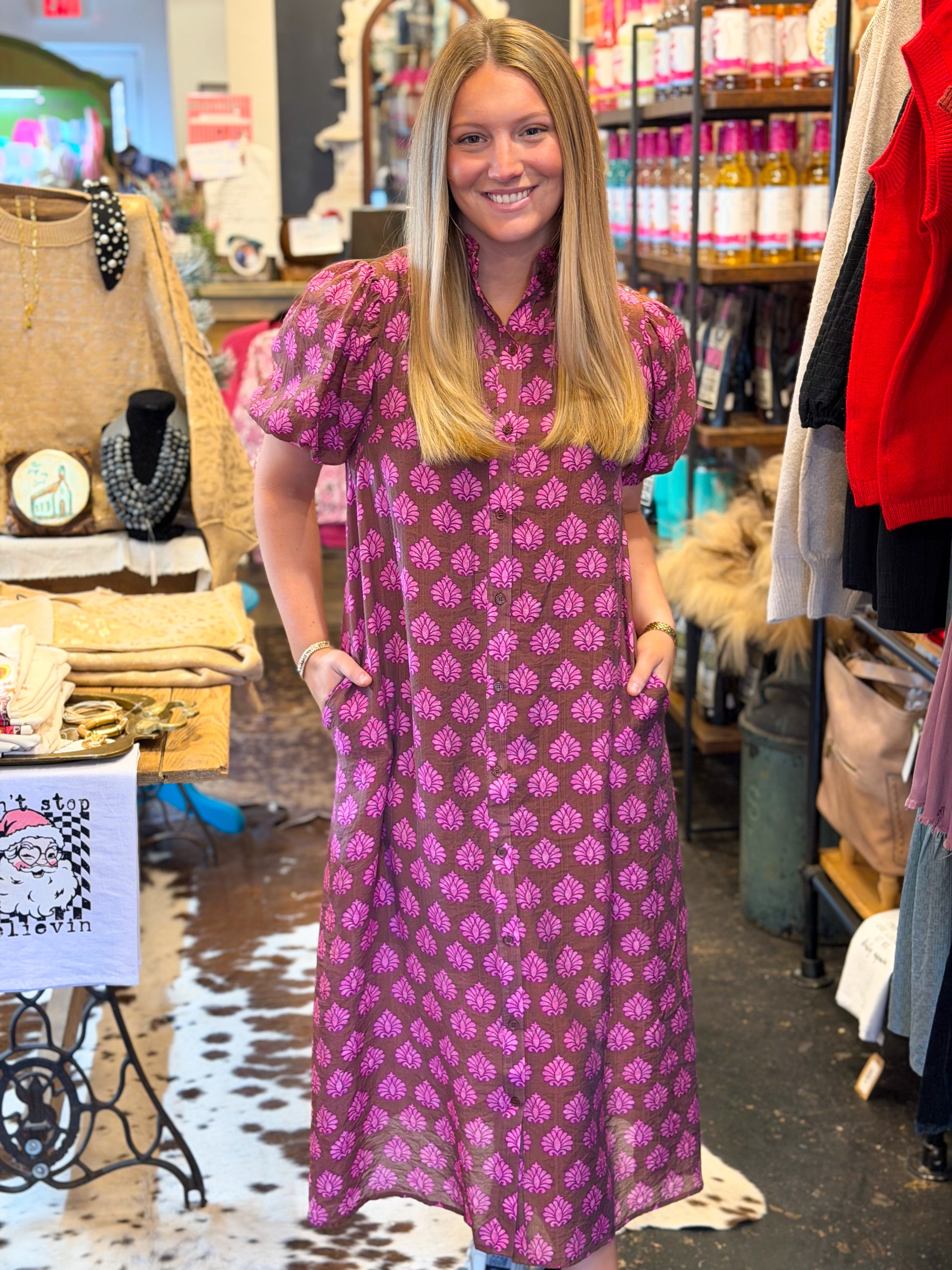 Unleash your inner fashionista with our Stylish Shelia Floral Dress! The brown and pink floral detail adds a touch of elegance, while the pockets provide convenience. The ruffle collar and puff sleeves give a romantic touch, and the midi length is perfect for any occasion. Get ready to turn heads and feel confident in this must-have dress!