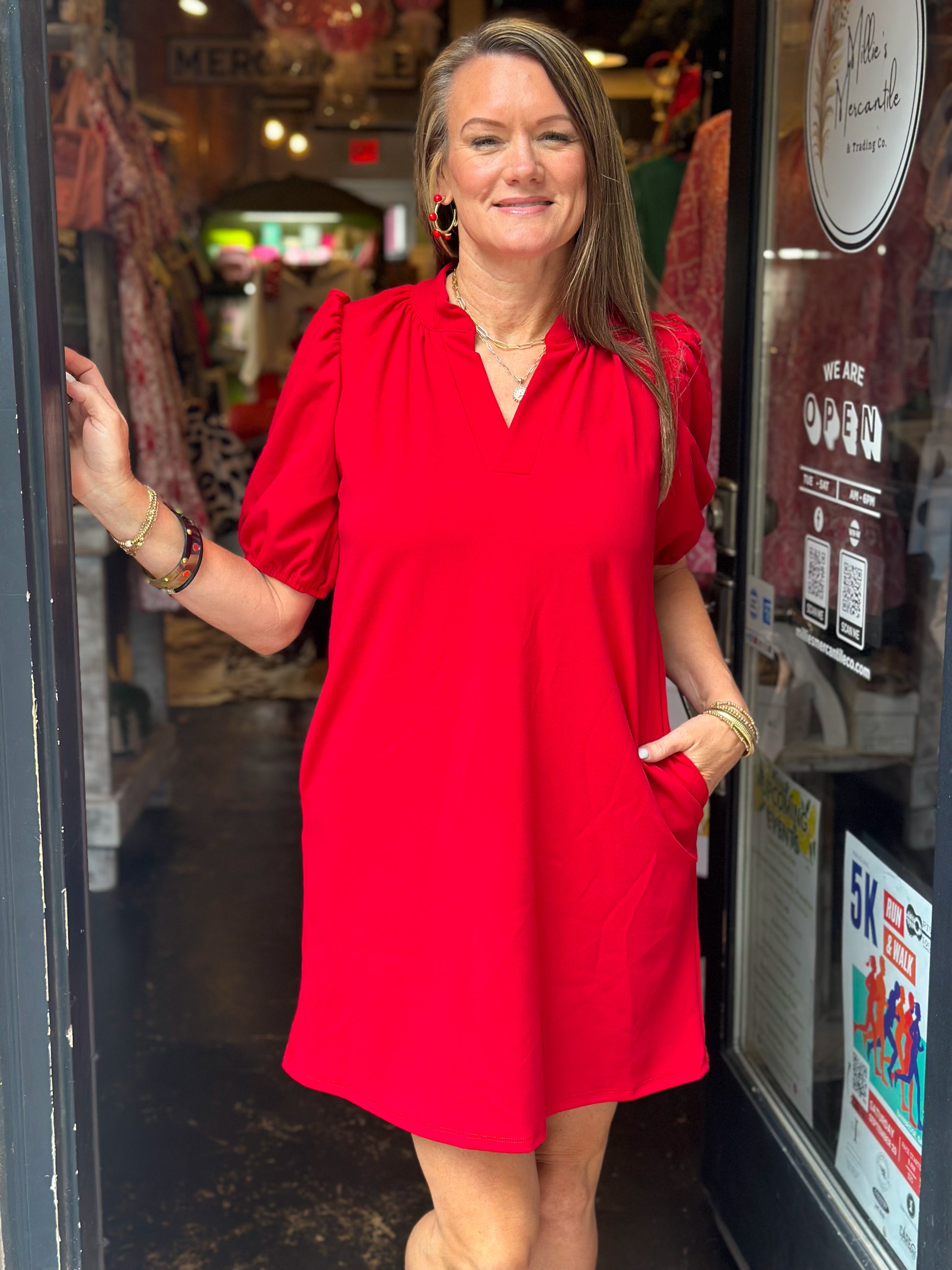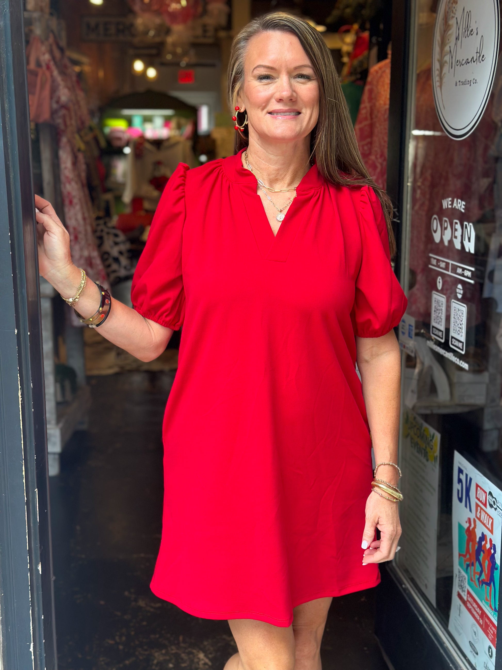 Score a fashion touchdown with the Touchdown Dress! In bold Georgia Bulldog red and featuring playful puff sleeves, this versatile dress is perfect for dressing up or down on game day. Go for the win and show off your playful and quirky style with this must-have dress!