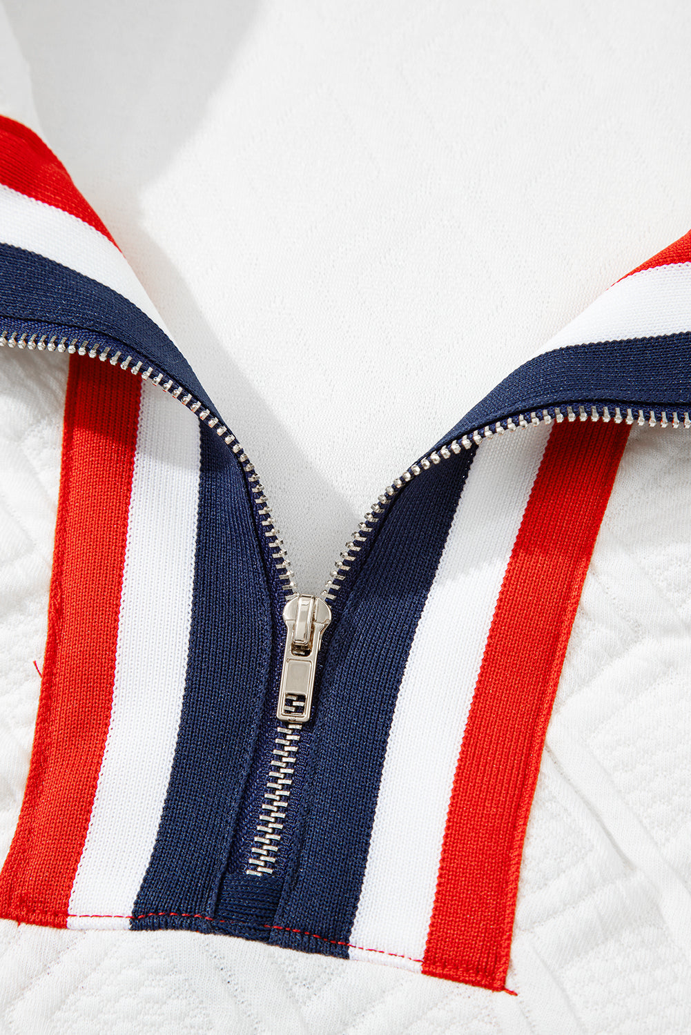 White Textured Jacquard Colorblock Edge Puff Sleeve Quarter Zip Mini Dress